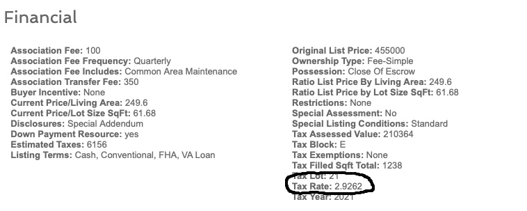 The easiest way is to find out the property tax rate for a home you are considering is to head over to our Austin Home Search tool and pull up the house you are considering. Then, scroll down under “Financial” and look for the field that says “Tax Rate”. Here is a screen shot of what you should be looking for.