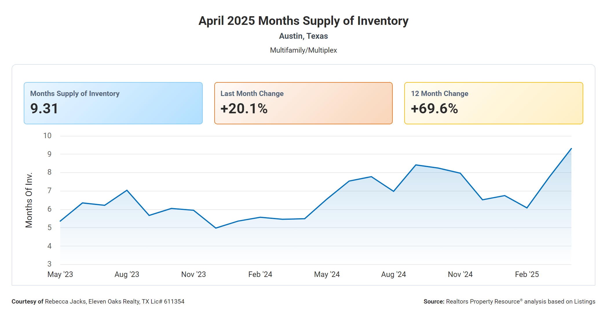 In April 2025, there was 9.31 months of inventory on the Austin multi family market compared to 5.49 months in April 2024, showing a 69.6% increase in year over year numbers. Last month there was 7.75 month of inventory on the market showing a 20.1% increase in month over month comparisons.