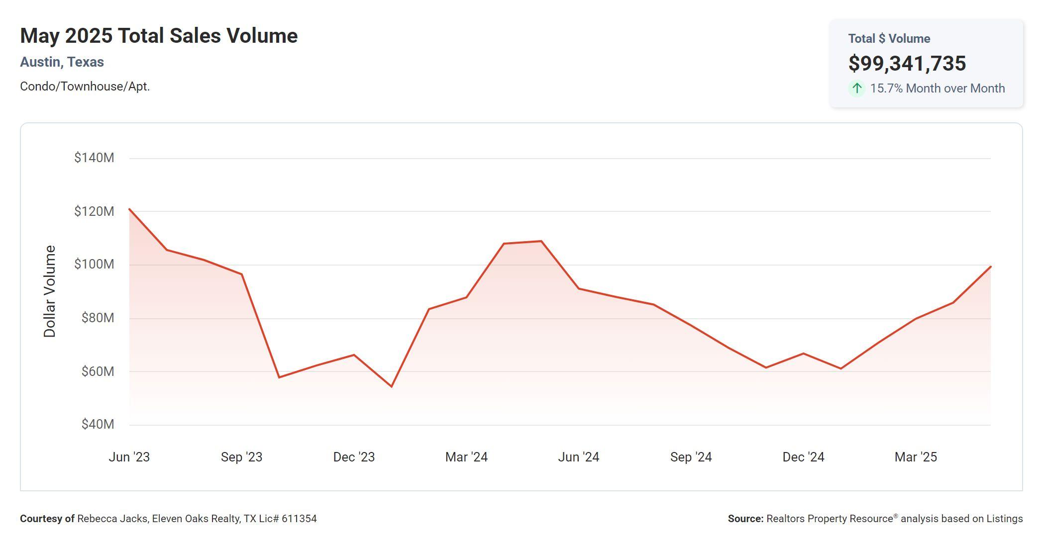 In May 2025, the total sales volume for condos in Austin was $99,341,735 compared to $108.9MM in May 2024, showing an 8.8% decrease in year over year numbers. Last month the total sales volume was $85.88MM, showing a 15.7% increase in month over month comparisons.