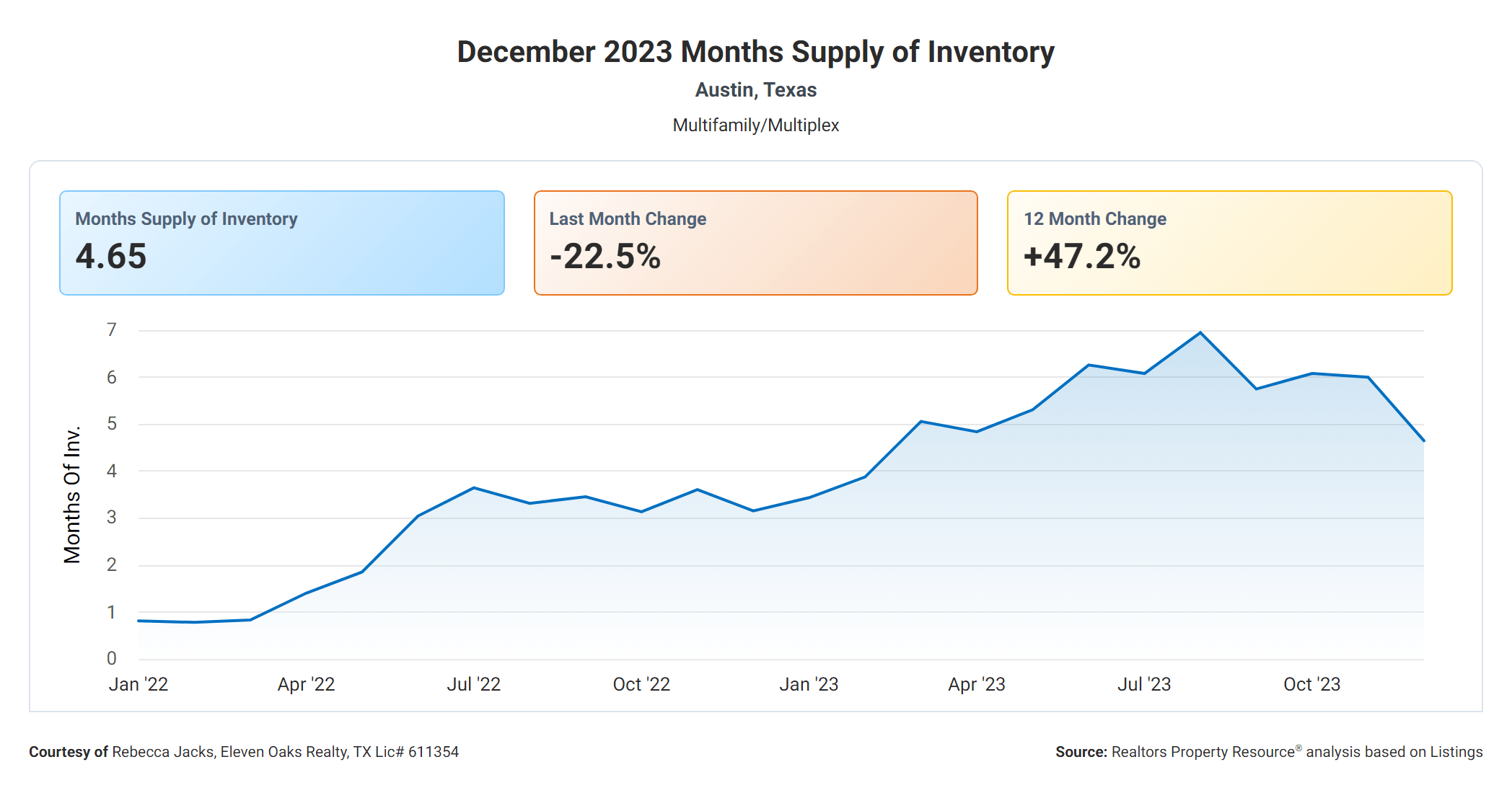 In December 2023, there was 4.65 months of inventory on the Austin multi family property market compared to 3.16 months in December 2022, showing a 47.2% increase in year over year comparisons. Last month there were 6 months of inventory on the Austin market showing a 22.5% decrease in month over month comparisons.