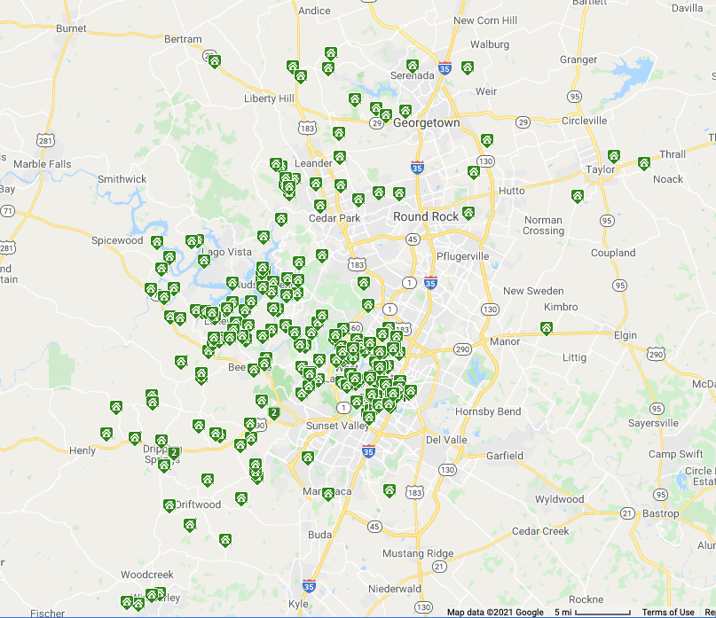 Here is a map view of the 233 luxury homes currently for sale in the Austin area as of May 12, 2021. 174 are located in Travis County, 29 in Hays County and 30 in Williamson County.