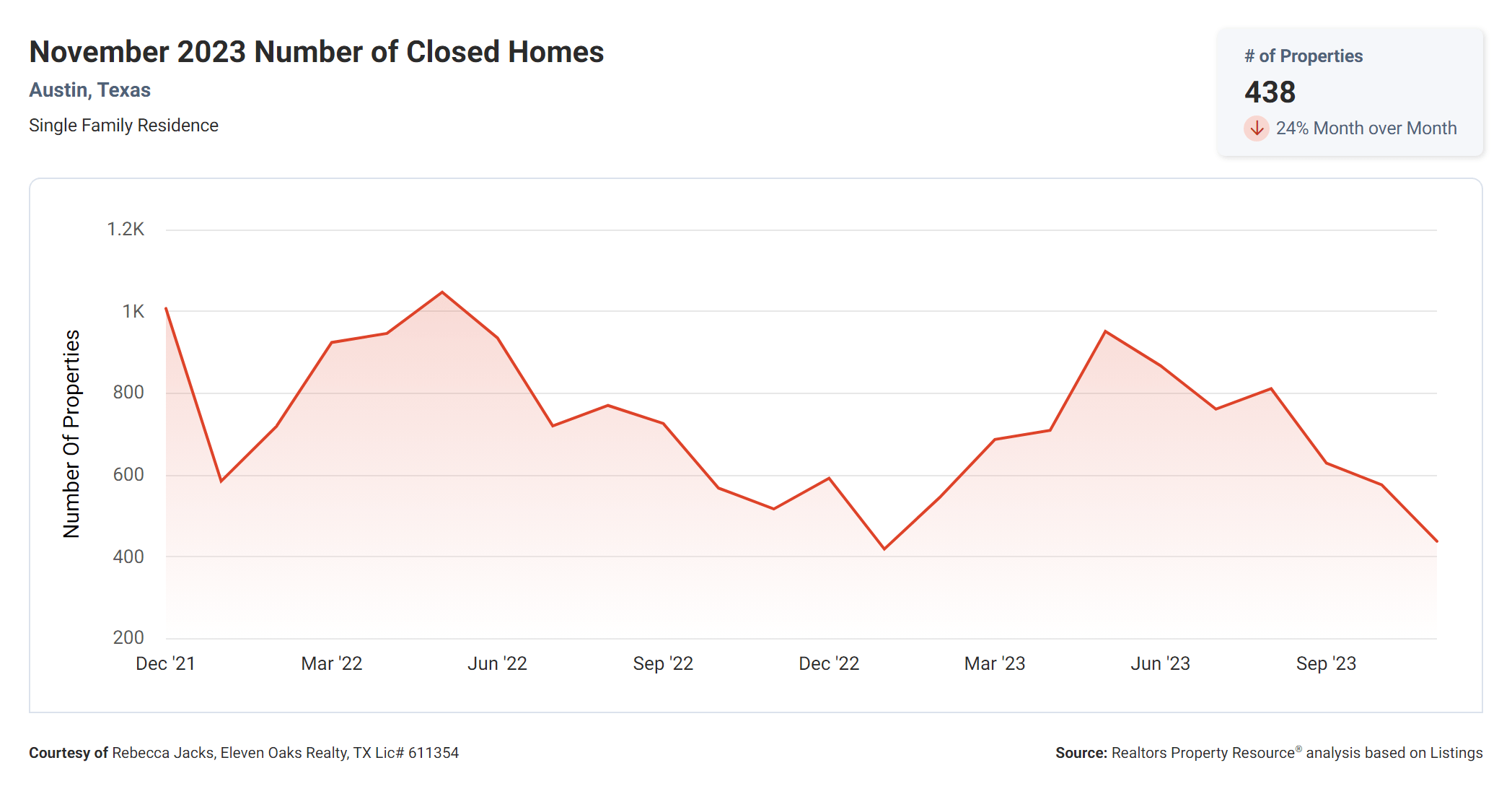 Eleven Oaks Realty is proud to present their November 2023 Austin Real Estate Price Report measuring activity in the single family home market.