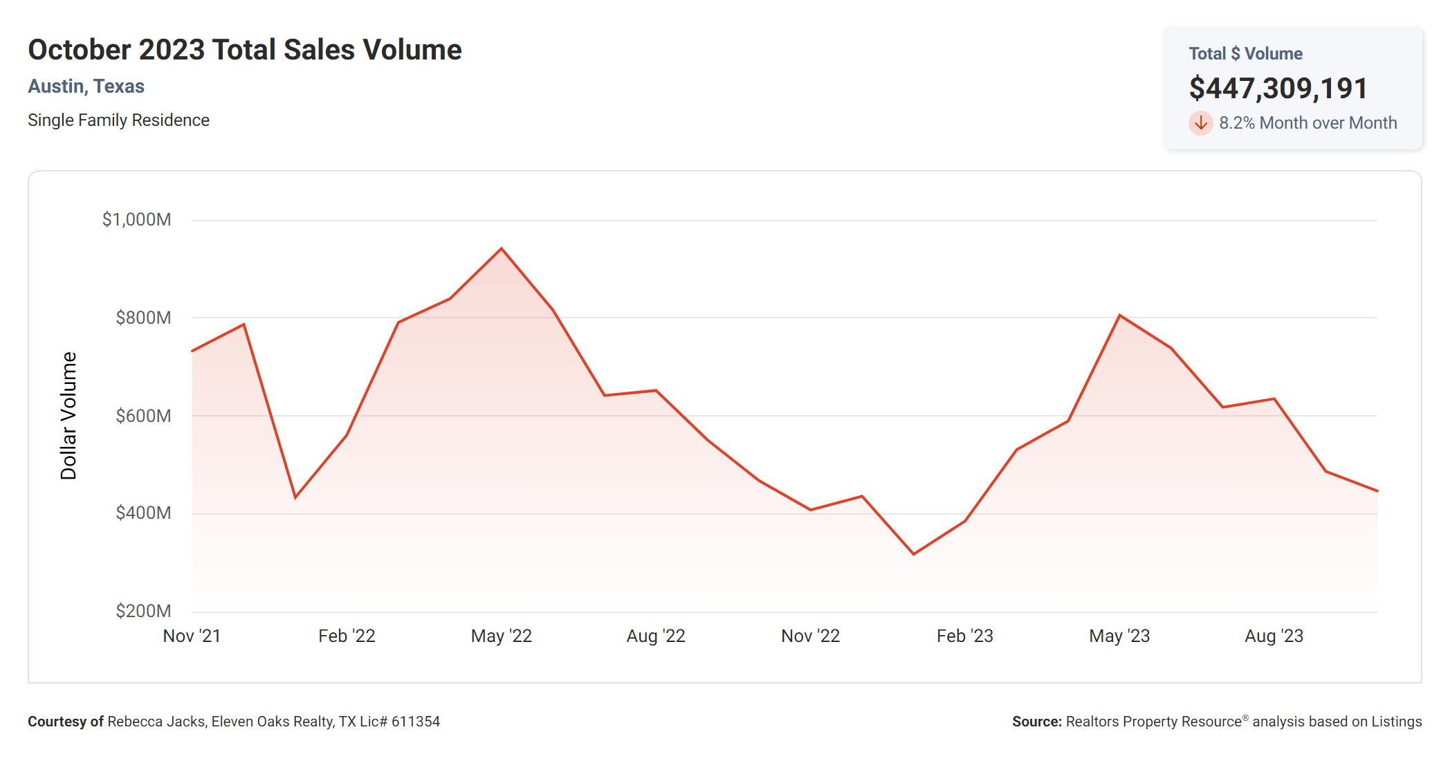 In October 2023, the total sales volume for single family homes in Austin was $447,309,191 compared to $468.09MM in October 2022, showing a 4.4% decrease in year over year numbers. Last month, the total sales volume was $487.24MM, showing an 8.2% decrease in month over month numbers.